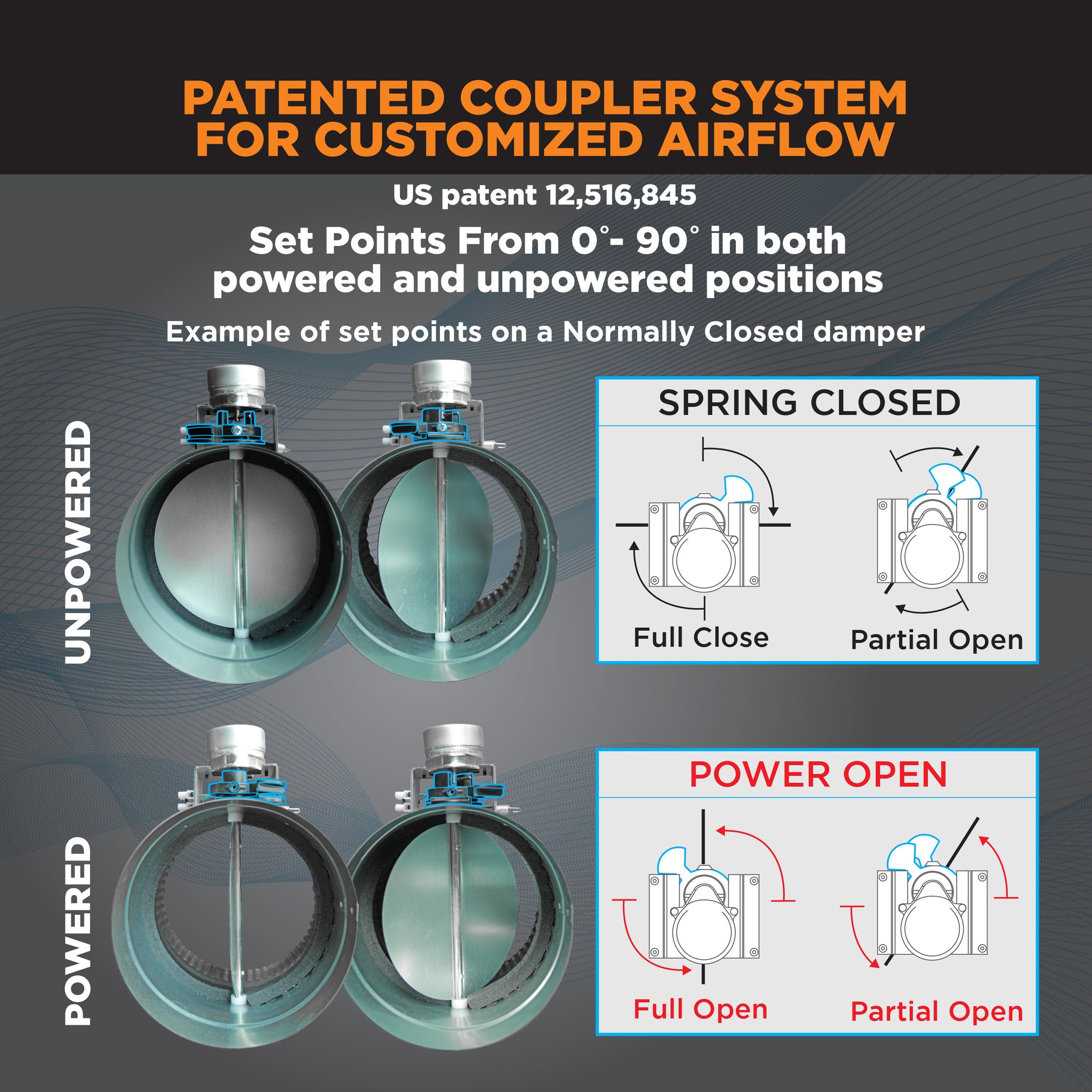 - Patented Adjustable Coupler with set points from 0-90 degrees in both powered and unpowered positions. US patent 12,516,845
